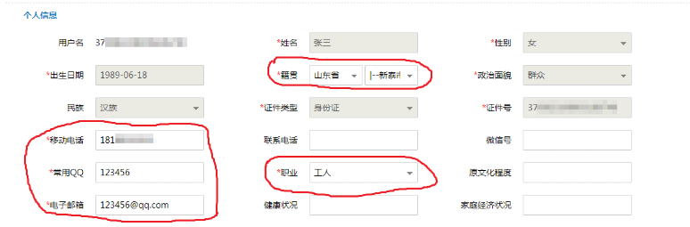 (3)在“修改个人信息”界面中核对本人信息是否正确(不可更改部分),完善个人信息(红色圈起的内容为必填内容),填写完毕“保存个人信息”。(见图3)